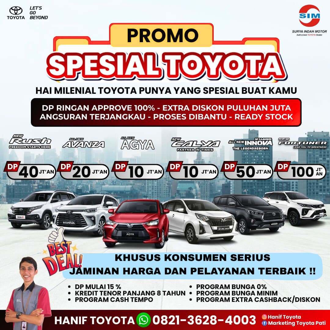 Promo Toyota Kudus selalu memberikan promo menarik untuk pembelian unit mobil Toyota. Selalu ada penawaran terbaik Promo Dealer Toyota Kudus untuk setiap bulannya. Dapatkan semua mulai dari DP Sangat Murah / Cicilan Sangat Ringan / Promo Menarik, dan berbagai macam penawaran menarik lainnya hanya di Promo Toyota Kudus.